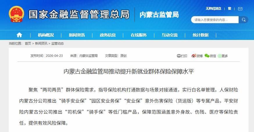 4月23日股票配资持仓,据内蒙古金融监管局网站,内蒙古金融监管局发文推动提升新就业群体保险保障水平,其中提到聚焦“两司两员”群体保险需求,指导保险机构打通数据与场景对接通道,实行白名单管理。人保财险内蒙古分公司推出“骑手安业保”“园区安业务保”“安业保”意外伤害保险(货运版)等专属产品,平安财险内蒙古分公司推出“司机保”“骑手保”等低门槛产品,保障范围涵盖意外身故、伤残、医疗等保险责任,提供有效风险保障。
